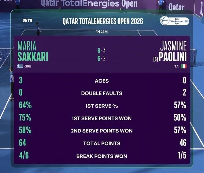 ⚡ Мария Саккари обыграла Жасмин Паолини во втором круге WTA 1000 Doha со счетом 6-4, 6-2.