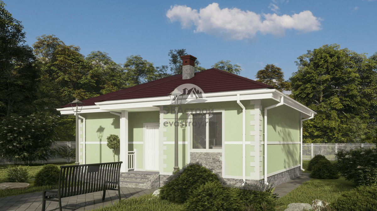 Номер проекта: 107-21 (П64-1) Разделы проекта: Архитектурный и Конструктивный разделы Узнать о проекте больше можно на сайте evastroy.ru или по телефону +7 (495) 175-30-40 Компактный одноэтажный дом на две спальни, общей площадью 54 м2 и габаритами 8.24 x 9.7 м. Хороший вариант для тех, кто ищет идею небольшой экономичной дачи. Мини-коттедж рассчитан на двух-трех жильцов. Архитектурный стиль — европейский. Состав помещений: 2 спальни, кухня, санузел, ванная/бойлерная, тамбур, холл. Преимущества проекта: благодаря скромным размерам дом можно ставить на малых участках; отсутствие второго этажа удобно для детей и пожилых; простая конструкция и доступные материалы облегчают строительство. С крыльца заходит в тамбур, в правой части которого будут размещены шкафы-купе. Центральный холл окружают: слева — спальни, справа — кухня и санблок/котельная, прямо — санузел. Спальни одинаковы по размеру — 9,3 м2, меблировка состоит из двуспальной кровати, тумбочек и вещевых шкафов. Окна выходят на левы