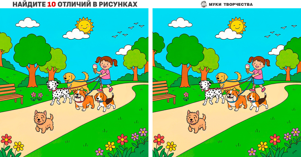Хочется уже летнего настроения и тепла. Поэтому сегодня перед вами две похожие картинки с летней атмосферой. Милая девочка с мороженным выгуливает своих собачек в парке. Эти две картинки выглядят одинаковыми, но в одной художник аккуратно сделал 10-ть отличий. Постарайтесь найти все отличия не прибегая к ответу-подсказке, который будет в конце этой статьи. Отнеситесь к возможным трудностям в поиске, как к тренировке своего мозга. Это полезное упражнение на внимание и концентрацию. Горизонтальная версия задачки: Девочка выгуливает питомцев Вертикальная версия задачки: Девочка выгуливает питомцев ОТВЕТ-ПОДСКАЗКА БУДЕТ НИЖЕ: ОПачки ТУТ Есть Ещё Задачки На Внимание: