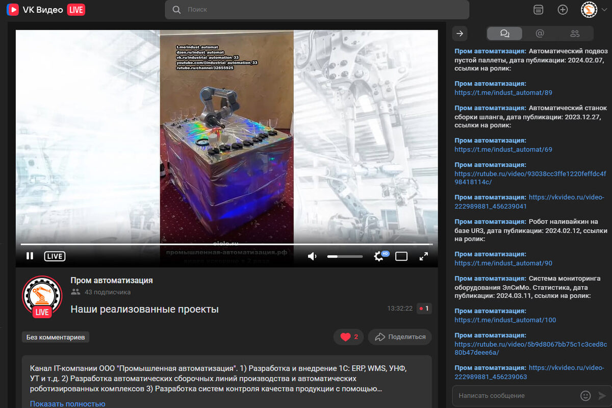 Перезапустил бесконечный стрим из наших роликов на площадке VK Видео LIVE. Обычно такие вещи делают на компьютерах с Windows + OBS + VLC. Наш стрим работает на виртуальном VDS-сервере + Python + FFMPEG. Т.к. стримом управляет Python, то я знаю какой конкретно ролик в данный момент воспроизводится, и с помощью API для разработчиков сообщаю в чат название ролика и ссылку на первоисточник, так же стрим автоматически перезапускается каждые 3 дня и автоматически обновляет список роликов. Подключайтесь, адрес https://live.vkvideo.ru/indust_automat ! Если у вас есть потребность в подобном решении, пишите: @zimichev или на почту industrial.automation.33@yandex.ru Язык программирования: Python Хеш теги: #python , #бережливоепроизводство