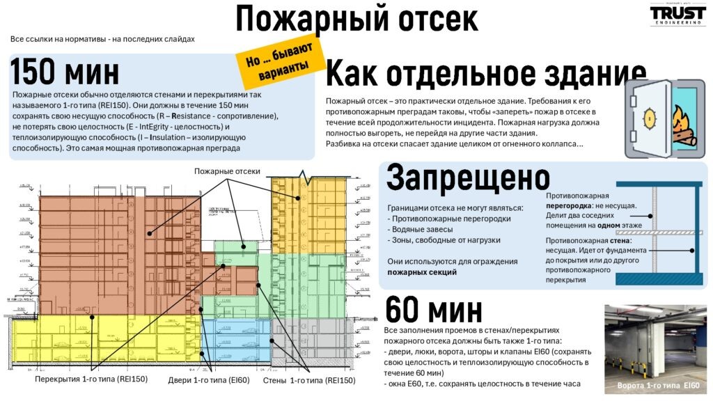 Пожарный отсек – это практически отдельное здание. Требования к его противопожарным преградам таковы, чтобы «запереть» пожар в отсеке в течение всей продолжительности инцидента. Пожарная нагрузка должна полностью выгореть, не перейдя на другие части здания. Разбивка на отсеки спасает здание целиком от огненного коллапса…