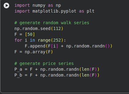 Основная идея парной торговли заключается в том, чтобы найти пары ценных бумаг (обычно с одинаковыми рисками), которые имеют тенденцию двигаться в одном направлении. Мы рассчитываем найти долгосрочную равновесную зависимость между ценами на эти ценные бумаги. Как только мы замечаем отклонения от равновесия, мы можем воспользоваться этим и получить прибыль. Существует множество статей, в которых описываются общие аспекты стратегий торговли валютными парами. Давайте посмотрим, как это работает, на простом примере с синтетическими данными. Сначала нам нужно сгенерировать ряд цен на акции. Допустим, у нас есть две акции: A и B. Их цены зависят от общего фактора F и некоторого шума. Предположим, что F подчиняется процессу случайного блуждания. Тогда у нас есть: Ниже приведен код на Python, который использовался для расчета цен на акции. Мы сгенерировали 252 точки данных, которые можно рассматривать как цены закрытия за один год (252 торговых дня). Если рассматривать ценовые ряды двух акций
