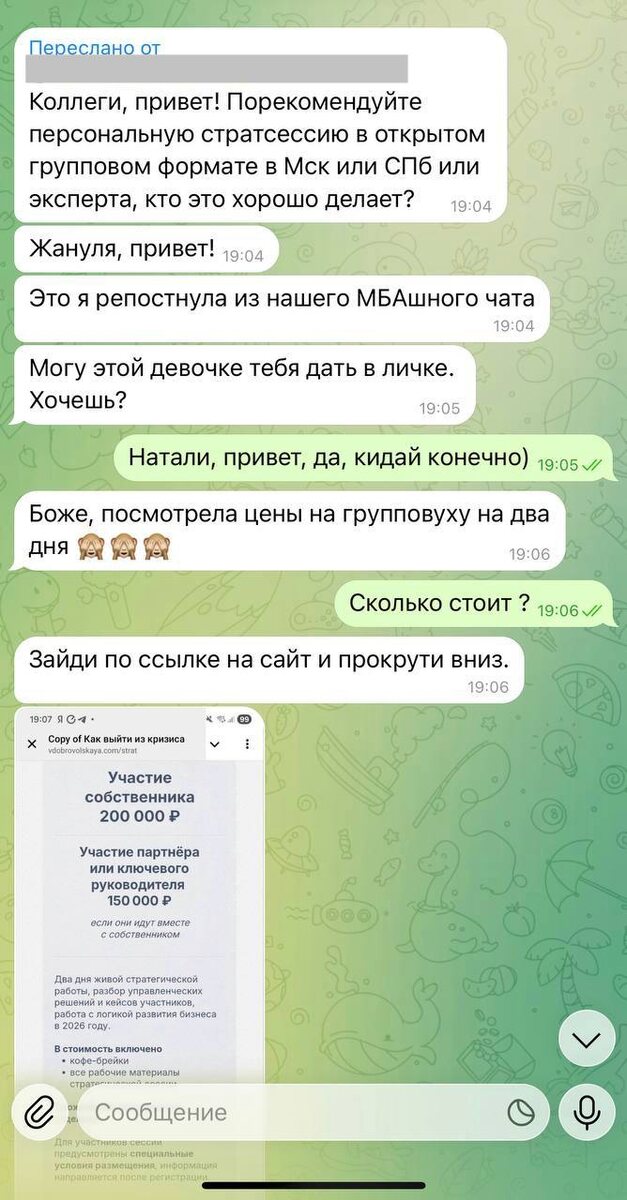 3 дня назад мне переслали сообщение из одного профессионального чата. Одна компания искала специалиста для проведения стратегической сессии в групповом формате по бизнес-тематике, Москва или Санкт-Петербург. Ребята начали делиться специалистами по страт сессиям и я зашла посмотреть расценки коллег. Два дня групповой стратегической работы стоит 200 000 рублей, если участвует сам собственник, а участие партнёра или руководителя 150 000 рублей. 2 дня работы с командой стоит ❗️ от 350 тыс в зависимости от количества участников. Это не индивидуальная терапия и не работа с личными переживаниями. Это два дня работы с мышлением предпринимателя, с управленческими решениями, фокусом на развитие, стратегией и дальнейшими шагами для достижения цели. И для бизнес-среды такие расценки выглядят абсолютно адекватно, без обсуждений «дорого или нет», стратегические сессии так стоят. За «деньги» люди платят деньги. В бизнес-среде чеки считаются иначе. 🔈 При этом многие психологи продолжают работать в ф