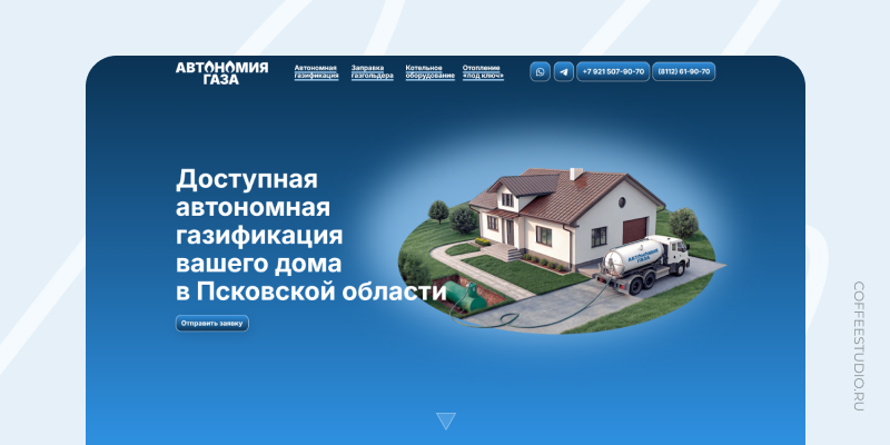 В начале 2025 года заказчик обратился в CoffeeStudio с просьбой в течение месяца разработать сайт на платформе Tilda для продвижения комплекса услуг под брендом «Автономная газификация».