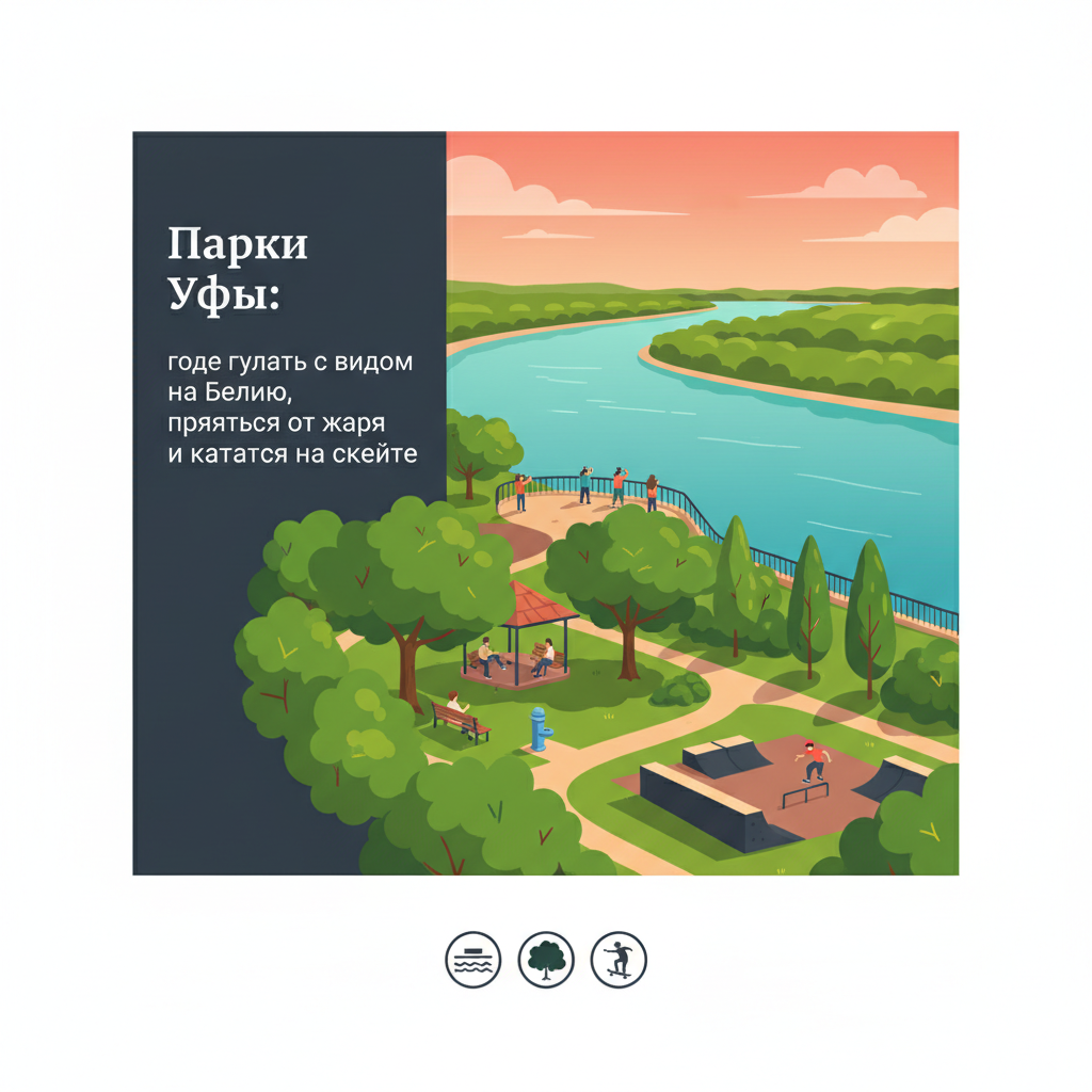 Это не просто парк, а культурный эпицентр города. Расположен между театрами — оперы и балета и драмы. 2. Для семейного отдыха и аттракционов: Парк им. Якутова (Парк Победы) и «Кашкадан» 3. Природа и панорамы: Парк «Ватан» и Ботанический сад 4. Набережная реки Белой — главная прогулочная артерия