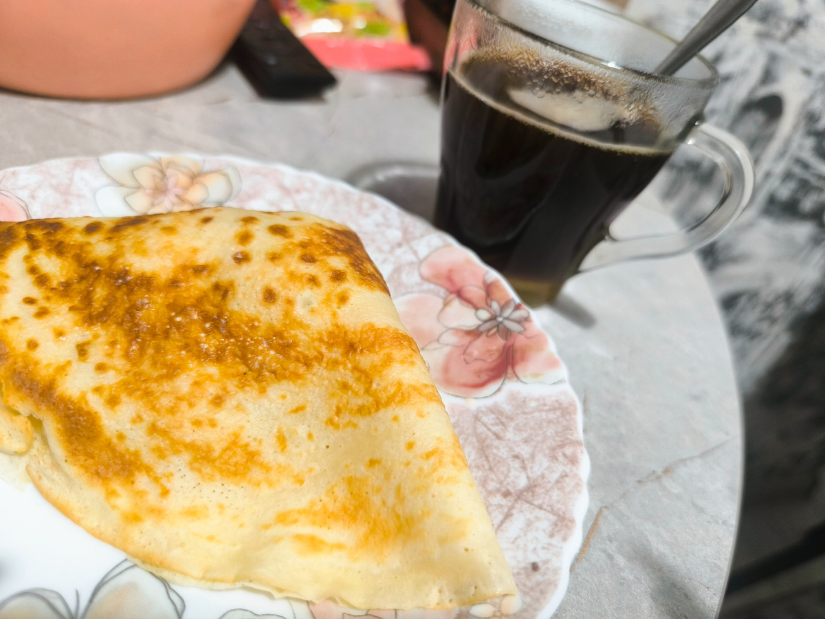 Кофе растворимый с сахаром. Блинчик пшеничный на кефире с творогом .+ коллаген, лицитин .