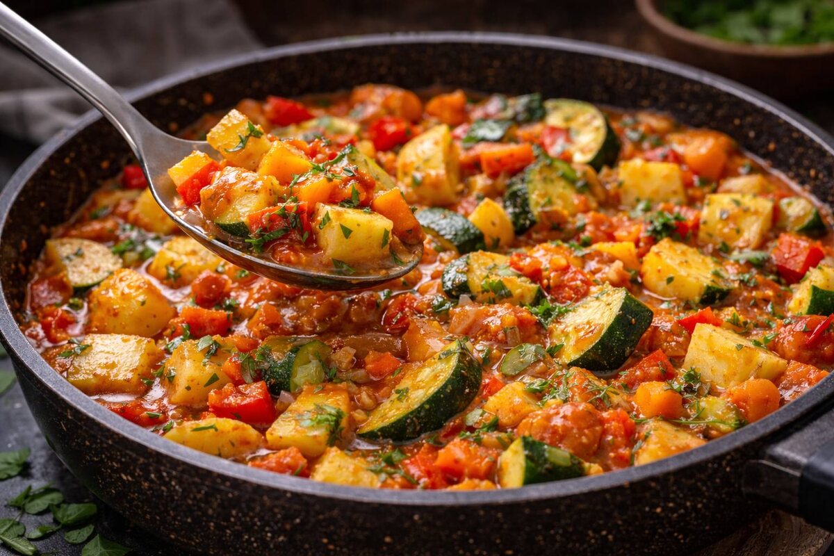 С овощным рагу у меня долго были сложные отношения. И вроде идея хорошая, и продукты нормальные, а в итоге одна и та же история: всё тушилось, мешалось, томилось… и превращалось в мягкую, бесформенную массу. Вкус есть, а есть не хочется. Потому что хочется жевать, а не угадывать, где тут был кабачок, а где картошка. В какой-то момент я поняла простую вещь: рагу разваливается потому что мы всё делаем одновременно. А овощи, между прочим, все разные. И если дать им чуть больше уважения, рагу получается совсем другим — с кусочками, текстурой и тем самым «нормальным» видом, когда ложка не тонет. Ингредиенты (на 4–5 порций): • Картофель 3–4 средних • Кабачок 1 средний • Болгарский перец 1–2 шт. • Морковь 1 крупная • Лук 1–2 шт. • Помидоры 2 шт. или 1 стакан томатов в собственном соку • Чеснок 2 зубчика • Растительное масло 3 ст. л. • Соль по вкусу • Чёрный перец по вкусу • Сушёные травы или паприка по желанию • Вода или овощной бульон 100–150 мл Главное правило: никакой мелкой нарезки. Овощи