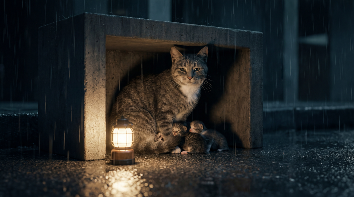 Она сама нашла это место. Обошла двор, нашла самый сухой угол под самым широким краем навеса, где капли не долетали. Может, проверила несколько мест, прежде чем выбрать. Принесла котят одного за другим, устроила их, легла сверху.