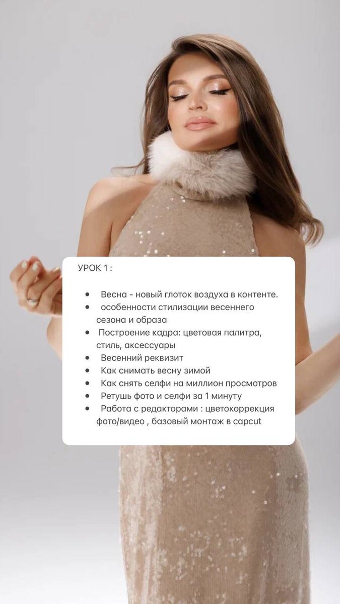 ? 📎 3 урока и 3 домашних задания 📎 персональная обратная связь и проверка ДЗ для каждой из участниц 📎 закрытый чат для общения 📎 призовых места с мотивирующими призами 💕 📎 секреты обработки фото и ретуши селфи 📎 фишки стилизации весеннего контента и образов 📎 рекомендации по продвижению 📎 самые актуальные идеи для контента 📎 коллосальная поддержка друг друга 📎 новые знакомства и колоссальная поддержка Как проходит? • марафон проходит в онлайн формате в закрытом тг канале • уроки можно смотреть в удобное вам время • доступ к урокам 3 месяца, можно спокойно проходить и пересматривать после окончания марафона Кому подойдет? • тем, кто хочет развивать соц.сети • тем, кто хочет получать подарки от брендов за контент • тем, кто просто хочет научиться красиво фотографировать себя и близких • мамам, которые хотят создавать красивые кадры детям • предпринимателям, которые продвигают свои товары или услуги через интернет • девушкам, которые хотят работать контент фотографами. Ко