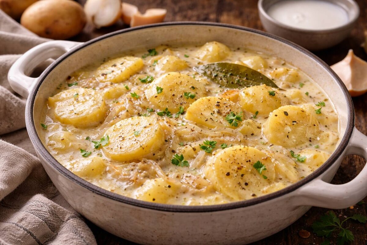 Картошка с молоком звучит странно ровно до того момента, пока не попробуешь. Я сама долго относилась к этому блюду с сомнением: ну что там может быть особенного: картофель, лук и молоко. А потом вспомнила, как так готовили раньше. И вот тут случается самое интересное. Картофель не разваливается, лук становится сладким, молоко превращается в густой соус, а блюдо вдруг перестаёт быть «бедным». А превращается в классное и интересное блюдо! Ингредиенты (на 3–4 порции): • Картофель 700–800 г • Лук 2 средних • Молоко 400–500 мл • Сливочное масло 20–30 г • Соль по вкусу • Чёрный перец по вкусу • Лавровый лист 1 шт. (по желанию) Форма подойдёт любая с толстым дном: сотейник, глубокая сковорода или кастрюля. Картофель чистим и режем крупными дольками или толстыми кружками. Мелко резать не нужно, здесь важна форма. Лук режем полукольцами или перьями. Молоко постепенно густеет, картофель пропитывается, а лук почти исчезает, оставляя после себя вкус. Соус получается мягким, сливочным, без тяжести