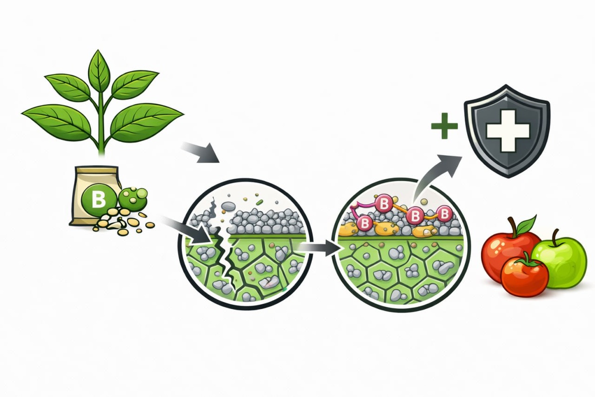 Бор часто воспринимают как элемент, отвечающий за цветение и налив плодов. Но на самом деле его роль выходит далеко за пределы репродуктивной функции - бор непосредственно участвует в защите растений. Механизм прост и одновременно изящен: бор формирует боро-пектиновые комплексы в клеточных стенках. Эти соединения укрепляют каркас стенок, повышая их прочность и упругость. В результате ткани становятся более цельными, снижается образование микротрещин и мелких повреждений - тех самых «ворот», через которые часто проникают патогены. Эффект на практике заметен особенно на плодовых культурах и рапсе. При достаточном обеспечении бором: ✔️снижается риск бактериальных гнилей и вторичных инфекций, ✔️плоды реже трескаются и повреждаются, ✔️ткани остаются более устойчивыми к механическим и биологическим стрессам. Бор - это не только элемент питания для роста и наливов. Это структурный фактор защиты, который снижает вероятность заражения ещё до того, как патоген сможет атаковать. Профилакти