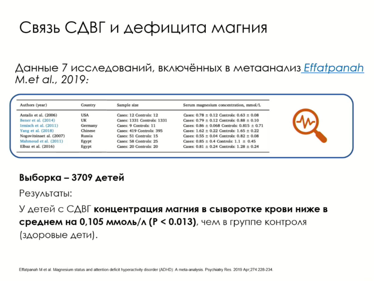 Если вы наблюдаете признаки СДВГ у детей — проверьте уровень магния. Недостаток магния приводит к росту импульсивности и гиперактивности за счет чрезмерной активности глутаматергической системы, которую магний тормозит