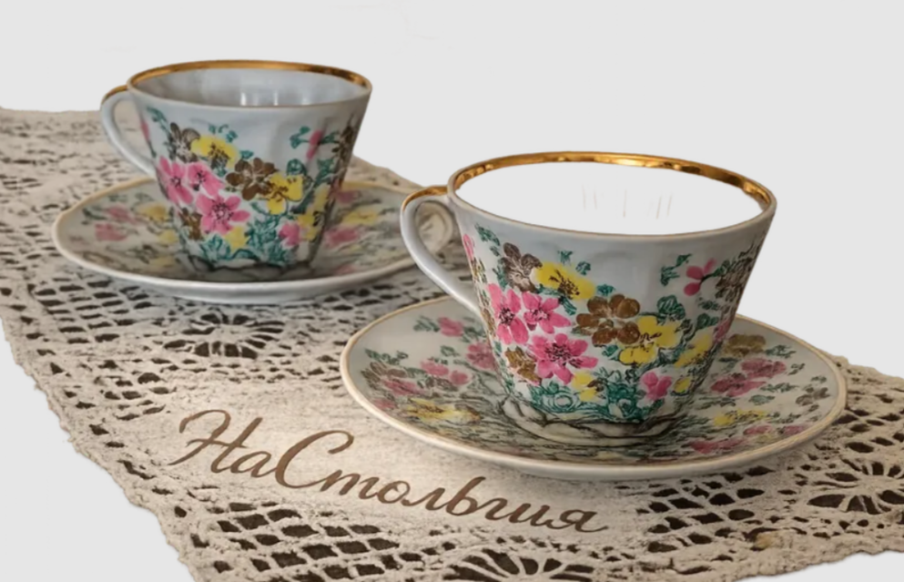Приветствую вас, друзья на канале НаСтолЬгия. Сегодня я с удовольствием представляю вам чайную пару «Ситец» в форме «Лучистая», произведённую на Ленинградском фарфоровом заводе (ЛФЗ) в 1970-е годы. Основной материал- это очень тонкий фарфор; деколь с рисунком «Ситец», дополнен отводкой золотом — изящная золотая окантовка по краю чашки и блюдца придаёт изделию особый шарм. «Лучистая» — узнаваемая форма с характерными «лучами», разработанная художником Ниной Павловной Славиной в 1970 году. На дне чашки и блюдца присутствует красное надглазурное клеймо «ЛФЗ» (Ломоносовский фарфоровый завод) — гарантия подлинности изделия. Это клеймо говорит о том, что изделие произведено на ЛФЗ (Ленинградский/Ломоносовский фарфоровый завод); относится к первому сорту (высшего качества); имеет декор 14-й группы сложности (достаточно сложный и детализированный рисунок); выпущено в период с 1970 по 1989 год (время использования системы «ГР» и сортности с цветовой маркировкой). Ленинградский фарфоров