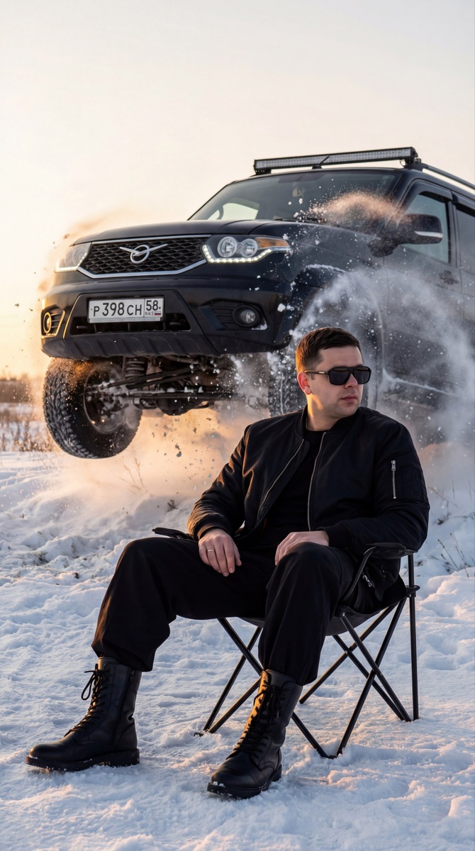 🤖Генерировать можно здесь: 👉БОТ ДЛЯ ГЕНЕРАЦИИ Выбираем режим Nano Banana Pro ИНСТРУКЦИЯ Кинематографичный средний план в формате 9:16: молодой мужчина с референсного фото, спокойно и расслабленно сидит на чёрном складном кемпинговом стуле в заснеженной степи, не обращая внимания на камеру. Он одет в чёрный наряд: черная куртка бомбер, широкие штаны и высокие берцы. На нем стильные черные солнцезащитные очки Carrera. Прямо позади него в кадр врывается массивный автомобиль с референсного фото с Российским государственным номером (сохранить точь-в-точь), совершающий высокий прыжок и агрессивно приземляющийся с мощным взрывом снежной пыли. Подвеска автомобиля сильно сжимается при посадке, он останавливается в нескольких дюймах от его спины — создаёт напряжённую, но контролируемую драму. Золотой час зимнего заката — холодный, контрастный свет, подчёркивающий блеск кожи, металла и снега. Стиль — вирусный для соцсетей, высокий контраст, хаотичный фон (снежная пыль, размытый снег, движение