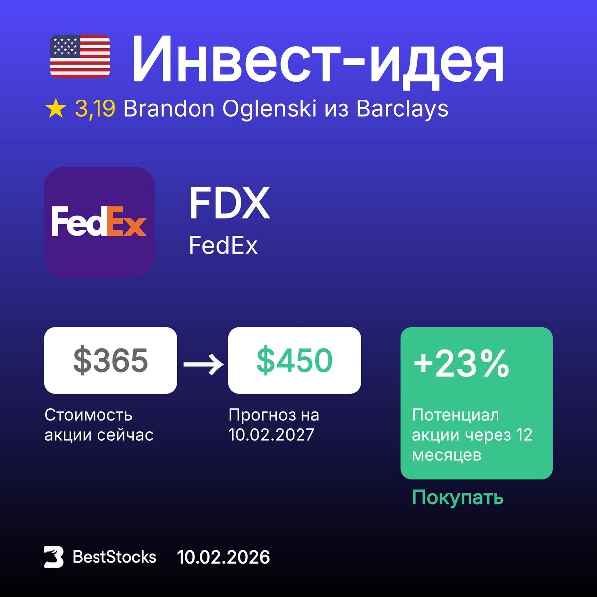 Тикер: FDX Прогнозная цена: $450 (+23%) Рекомендация: Покупать InvestRank акции: 9 из 10 Прогноз сделан: 10.02.2026 Прогноз до: 10.02.2027 Инвест-компания: Barclays Аналитик: Brandon Oglenski Ещё рекомендации на сегодня → ••••• 📢📢📢 Подписывайтесь на бесплатные каналы BestStocks: Дивиденды России • Инвест-идеи по акциям США • Дивиденды США