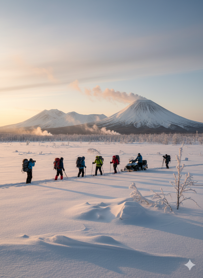 - Как добраться до достопримечательностей на Камчатке зимой? Из Петропавловска-Камчатского большинство объектов доступны на автомобиле или такси. До удалённых мест, таких как вулканы и дикие источники, добираются на снегоходах или вездеходах, а до Долины гейзеров — только на вертолёте.