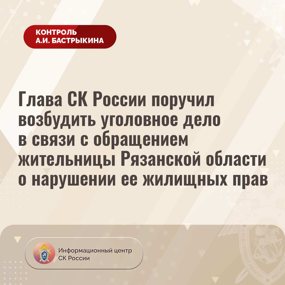Глава СК России поручил возбудить уголовное дело в связи с обращением жительницы Рязанской области о нарушении ее жилищных прав В приёмную Председателя СК России А.И. Бастрыкина в социальной сети «ВКонтакте» обратилась жительница Рязанской области по вопросу нарушения ее жилищных прав. С 2022 года в квартире женщины в жилом доме 1977 года постройки на улице Строителей города Новомичуринска из-за нарушений, допущенных при проведении капитального ремонта фасада, при низких температурах воздуха промерзают стены. Обращения в различные инстанции результатов не принесли. Председатель Следственного комитета Российской Федерации Александр Иванович Бастрыкин поручил руководителю СУ СК России по Рязанской области Олегу Алексеевичу Васильеву возбудить уголовное дело и представить доклад о предварительных и окончательных результатах его расследования. Исполнение поручения поставлено на контроль в центральном аппарате ведомства. #СледственныйКомитет #СКРоссии #СК #ИЦСКР #ИнформационныйЦентр #Алекса