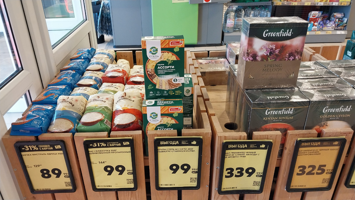 При входе витрина с продукцией по скидке, гречневая и рисовая крупа. Чай Гринфилд в ассортименте .