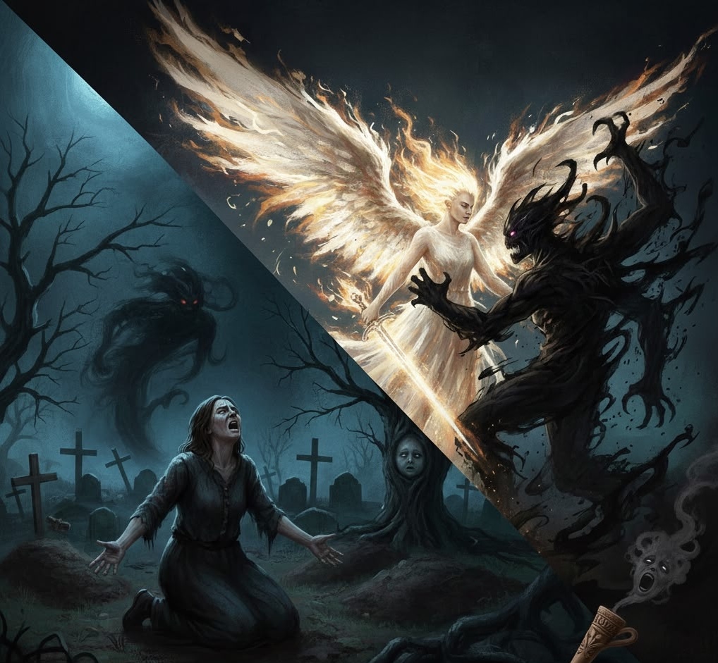 Но вдруг пространство раскололось сиянием. Наперерез тени метнулось нечто, сотканное из ослепительного, яростного белого пламени. Это не был добрый ангел с икон — это был Воин Света, чьи крылья гудели, как лесной пожар.