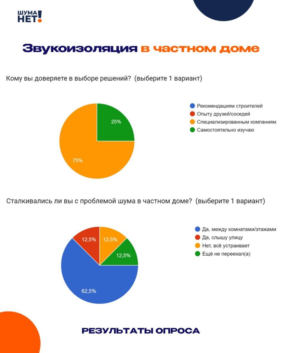 Мы опросили людей, которые планируют строить частный дом или уже имеют опыт его постройки и эксплуатации. Вот что они рассказали: Проблема шума — реальна 63% сталкивались с шумом внутри дома — между комнатами и этажами. Лишь 12,5% полностью довольны звукоизоляцией. Остальные либо ещё не переехали, но переживают, либо слышат улицу. Осведомлённость Половина участников считает, что знает технологии и материалы, остальные слышали о теме, но не вникали. Никто не сказал, что звукоизоляция точно не нужна. Застройщики молчат 63% опрошенных не получали от строительной компании опции звукоизоляции вообще. Остальные выбирали и реализовывали ЗИ самостоятельно. А если бы стоило +10%? Половина опрошенных согласны немного доплатить за звукоизоляцию, особенно если есть гарантии эффективности. Ещё четверть говорят о необходимости ЗИ хотя бы в ключевых зонах – спальнях и кабинетах. Что важно при выборе? — На первом месте: снижение шума на 60–70% (88%) — Далее: возможность смонтировать позже (38%), экол
