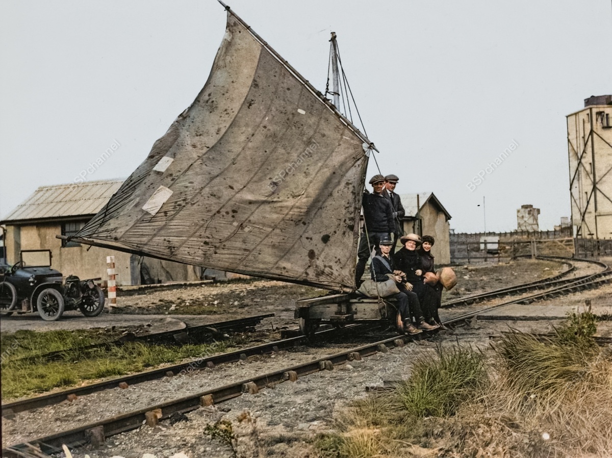 Группа мужчин едет по железнодорожным путям на вагонетке с парусным приводом в Сперн-Хед, Англия, 1922 год.