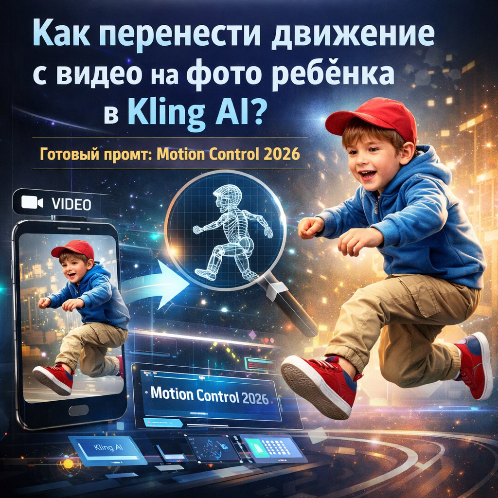 Привет! Если вы хотите оживить статичное фото ребёнка, добавив реалистичное движение из видео, Kling AI с функцией Motion Control - это идеальный инструмент. В этой статье я поделюсь готовым промтом для 2026 года, пошаговой инструкцией и расскажу, почему сайт aihere.ru станет вашим лучшим помощником в нейросетевом творчестве. Мы разберёмся, как анимировать фото ребенка в Kling AI, используя motion transfer - перенос движения с видео на изображение. Это просто, быстро и даёт потрясающие результаты для видео с анимацией лиц, танцами или жестами. Motion Control в Kling AI - это продвинутая фича для точного переноса движения. Вы загружаете видео с нужной анимацией (например, улыбка, поворот головы или прыжок) и фото ребёнка, а ИИ накладывает траектории движения на статичное изображение. Получается живое видео, где ребёнок на фото двигается естественно, без артефактов. Почему это круто для фото ребёнка: Kling AI популярен среди русскоязычных пользователей за простоту и качество motion tra