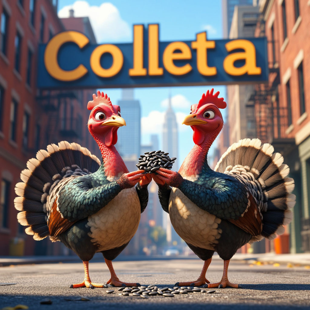 Юрик, важный индюк с пышным хвостом и привычкой говорить «Б‑бле‑е!», отправился в гипермаркет «Зверо‑Маркт» за семечками. Его вечный спутник — индюк Серый — поплёлся следом, ворча: