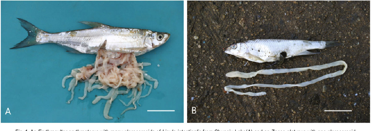 Взрослые ленточные черви (например, широкий лентец или ремнецы) живут в кишечнике окончательных хозяев. Для речных паразитов это обычно: