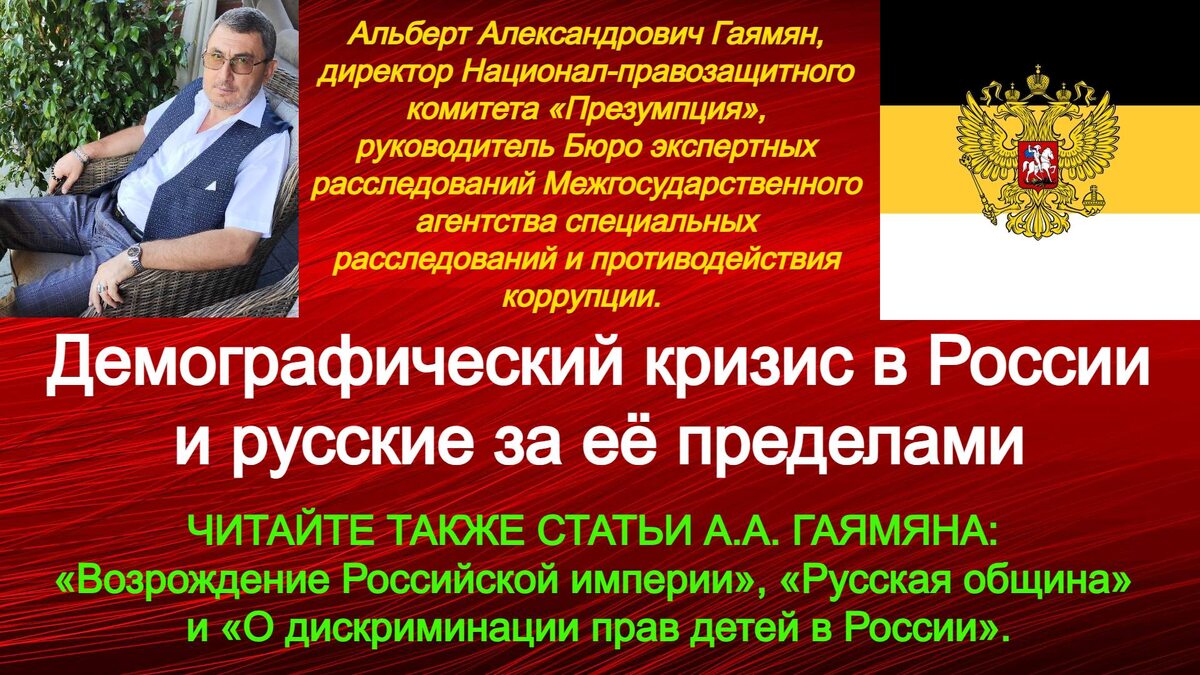 Статья директора Национал-правозащитного комитета «Презумпция», руководителя Бюро экспертных расследований Межгосударственного агентства специальных расследований и противодействия коррупции Альберта Александровича Гаямяна: «Демографический кризис в России и русские за её пределами. О демографическом кризисе в России и мигрантах, заполонивших страну, мы читаем и слышим часто, а вот о русских за пределами Отчизны вспоминают редко и не все. По разным подсчётам, в настоящее время за пределами России находятся от 20 до 30 миллионов этнических русских и их потомков, большинство из которых проживают в странах бывшего СССР. Будучи мудрым политиком и опытным юристом, Владимир Вольфович Жириновский систематически разъяснял всем нам необходимость репатриации русских в Россию. Помню, как летом 2001 года, во время одной из наших встреч с ним в Сочи, он эмоционально рассказывал о сотнях тысяч русских, униженно стоящих в очередях с мигрантами различных национальностей на получение российского гражда