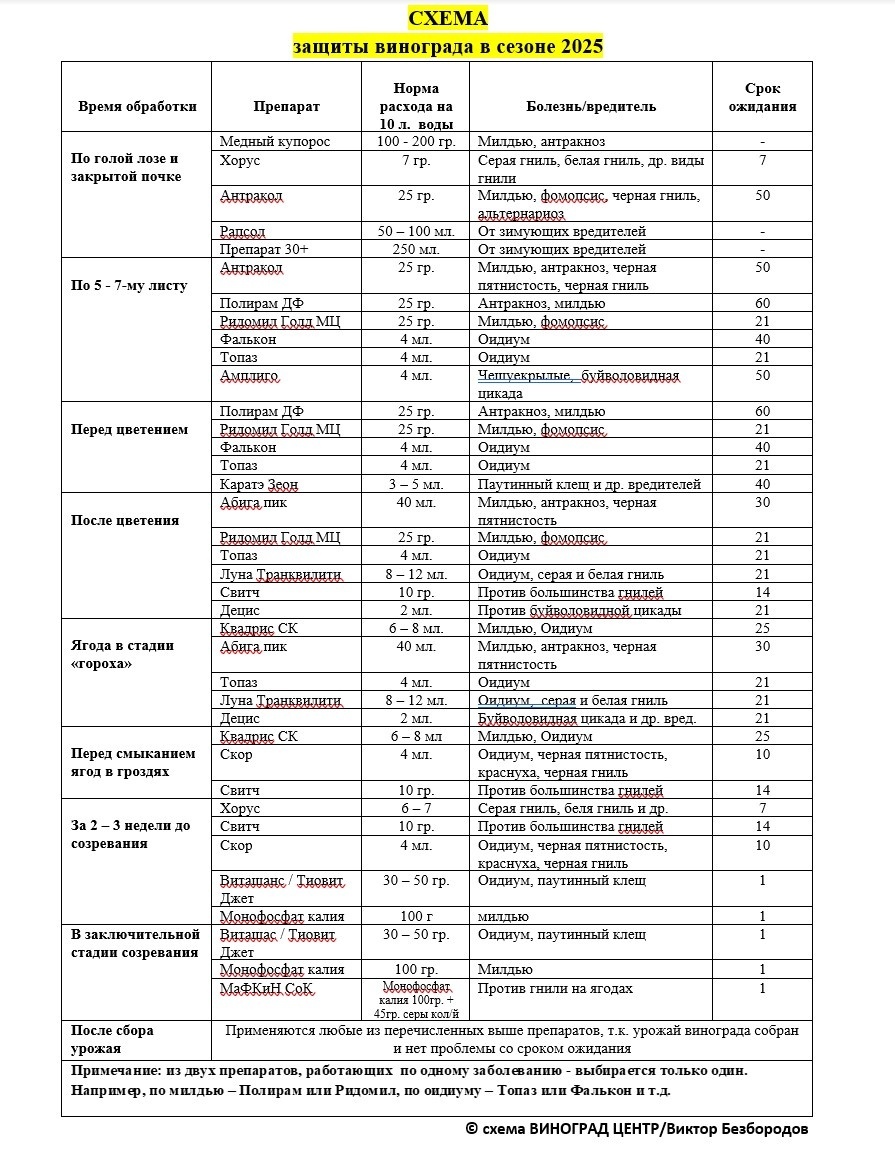 Ещё раз напомню, что по этой схеме можно смело работать и в 2026 году. Я её в этом году существенно подкорректировал под свои моменты. Убрал из обработок Ридомил голд МЦ и свёл до минимума некоторые препараты, которые часто использовал ранее (в частности медные).