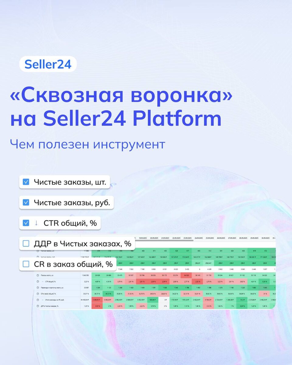 Включаешь рекламу, выключаешь, деньги тратятся, а что работает – непонятно. Как будто играешь в рулетку 🎰 Многие селлеры смотрят только на ДРР и думают, что всё под контролем. Но ДРР – это не показатель эффективности, а процент от выручки, потраченный на рекламу. Можно иметь красивый низкий ДРР и при этом совершенно неэффективную рекламу, которая не развивает карточку. Чтобы управлять будущим, нужно видеть весь путь клиента: показ → клик → корзина → заказ. В Seller24 Platform мы реализовали инструмент «Сквозная воронка». Он помогает анализировать конверсию на каждом этапе, чтобы вы понимали, где слабое звено и что нужно исправить. Вместо того, чтобы раз в месяц с тоской смотреть на ДРР, вы получаете инструмент для ежедневного управления. Например: увидеть, как изменение ставки или SEO влияют на показатели воронки. Концепция воронки универсальна, но её применение на Wildberries и Ozon отличается из-за разной модели оплаты рекламы. Посмотрим на различия. Wildberries (оплата за пока