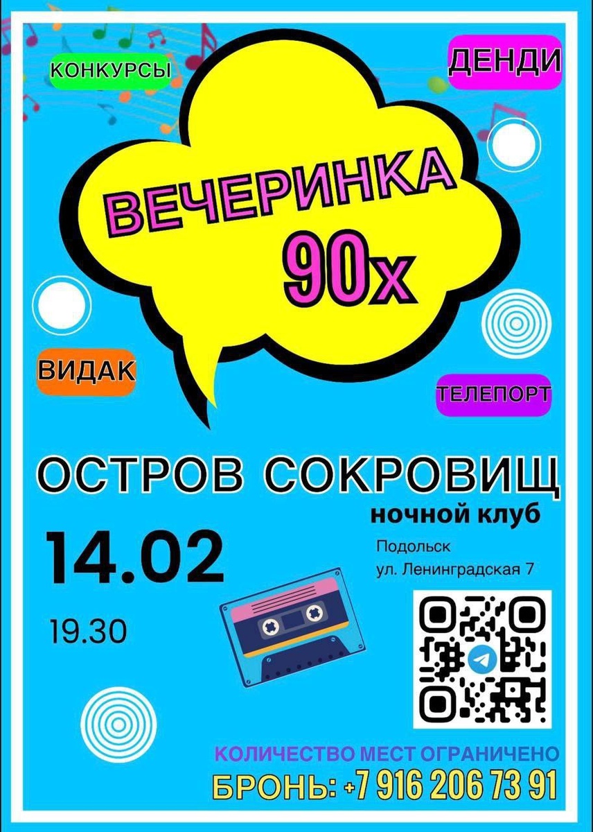 ! Пацаны и чувихи🕺💃 ❓Забыли как выглядит Онти, какой на вкус Dr Pepper и давно не водили пальцем по ковру на стене? Мы все это исправим‼️ Команда «Твой лучший праздник» объявляет о запуске самой мощной машины времени этого года⭐️ Забиваем вам стрелку в ночном клубе: «Остров сокровищ»🏖️ Программа полета ✈️ рассчитана на 5 часов. ➡️Фотозона с ковром! ➡️Видеосалон с кассетами! ➡️Зона игр в приставку! ➡️Те самые конкурсы из 90х! ➡️Ностальгические призы! ➡️Выбор лучшего мужского и женского костюма! ➡️И конечно твои любимые хиты! Всё от «Руки в верх», до «Ace of Base» 🍸Всем гостям Велком дринк! 🌐https://t.me/best_prazdnik ——————— 🛋️Количество мест ограничено! Билеты и бронь столов по номеру: +7 916 206 7391 💰 1500₽ 🚫 Возраст: 18+ 📆14.02.2026 🕛19:30 🏢 Ночной клуб "Остров сокровищ" 📍 г. Подольск, ул. Ленинградская, 7 ✅ Мероприятия Подольск https://dzen.ru/id/66ed500f7b5671493eca3fd6 http://vk.com/podolsk_events http://dzen.ru/podolsk_events