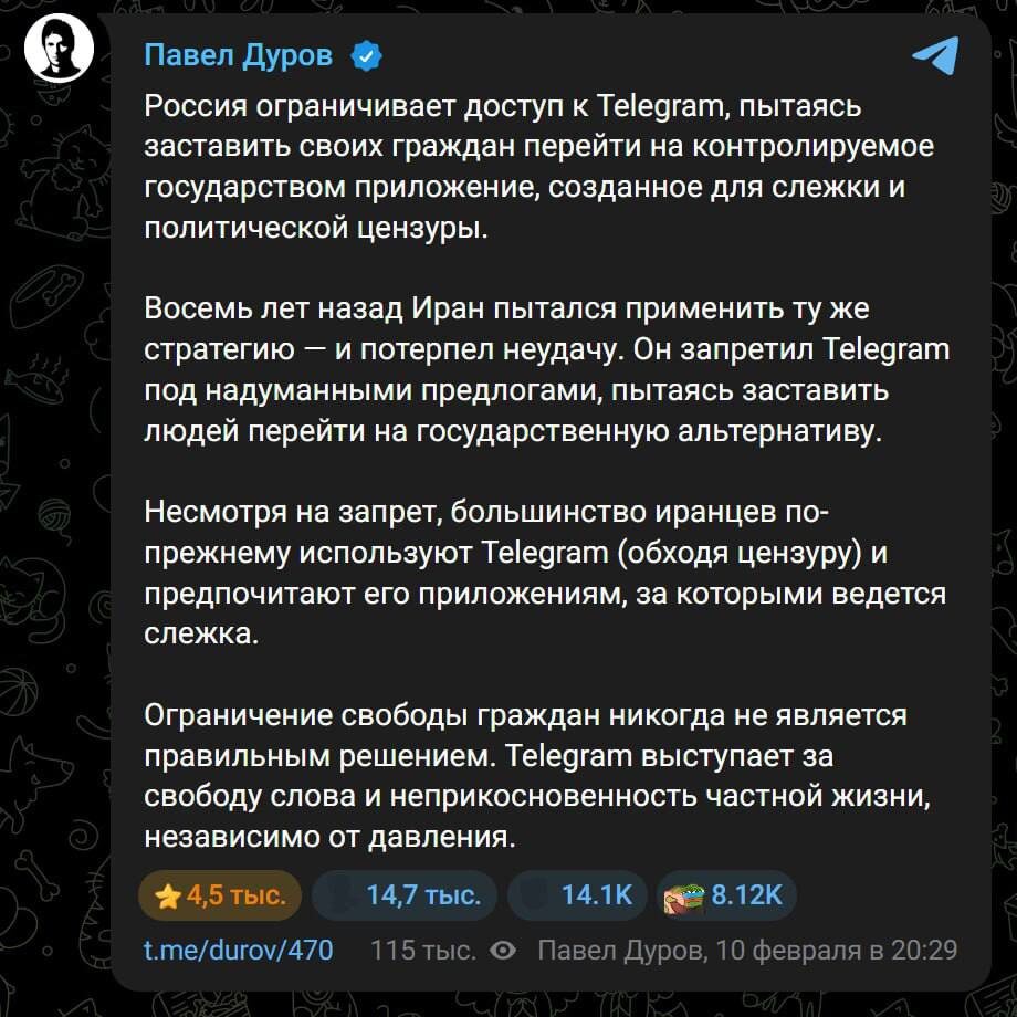Павел Дуров прокомментировал сообщения о блокировке Telegram в России, заявив, что ограничения доступа к мессенджеру направлены на принуждение граждан к использованию контролируемого государством приложения. По словам основателя Telegram, подобная стратегия уже применялась ранее в Иране. Власти этой страны около восьми лет назад попытались запретить мессенджер под формальными предлогами, рассчитывая перевести пользователей на государственную альтернативу. Однако, как отметил Дуров, инициатива провалилась — большинство иранцев до сих пор продолжают пользоваться Telegram, обходя цензурные ограничения, и сознательно избегают сервисов, связанных со слежкой и политической цензурой. Дуров подчеркнул, что ограничение цифровых свобод не приводит к желаемым результатам и лишь подрывает доверие граждан. По его словам, Telegram продолжит отстаивать принципы свободы слова и защиты конфиденциальности пользователей, независимо от внешнего давления. Основатель мессенджера также отметил, что история п