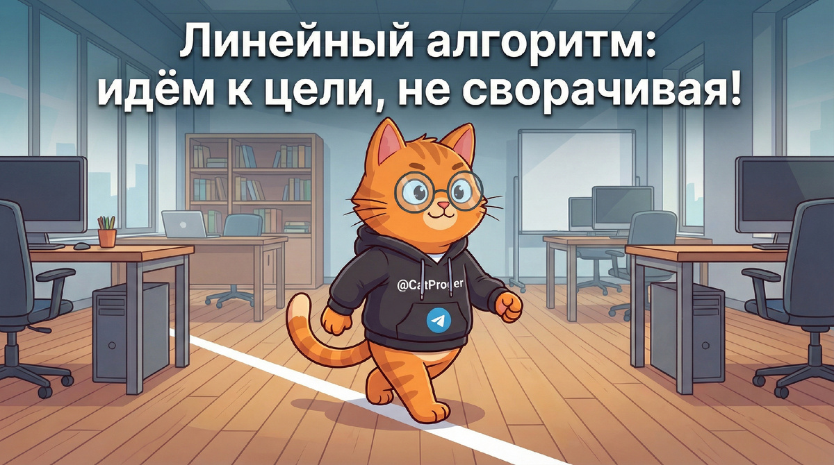 Мяу, котаны! На связи ваш главный специалист по прямолинейности и эффективности — Кот-прогер. Сегодня я наблюдал, как мой человек пытается следовать рецепту. Он постоянно бегал туда-сюда, перечитывал шаги, что-то забывал… Хаос и суета! И я подумал: люди, вам срочно нужен урок по самому простому и гениальному типу алгоритмов. По линейному алгоритму. Не пугайтесь умного слова! На самом деле, это самый ленивый и понятный способ что-либо делать. А в лени я профессионал. Линейный алгоритм — это просто последовательность действий, которые выполняются строго одно за другим. Шаг 1, потом шаг 2, потом шаг 3… Никаких “если”, “а вдруг” или “повторить 10 раз”. Только вперёд! Это мой идеальный утренний план “Добыча завтрака”: Видите? Ни одного лишнего шага. Никаких поворотов. Никаких сомнений. Я просто иду от начала до конца. Это и есть суть линейного алгоритма. Чтобы понять, что такое линейный алгоритм, важно понять, чем он НЕ является. Это НЕ ветвление (когда есть выбор):
