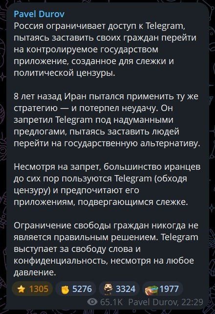 Павел Дуров прокомментировал ограничение работы Telegram в России.