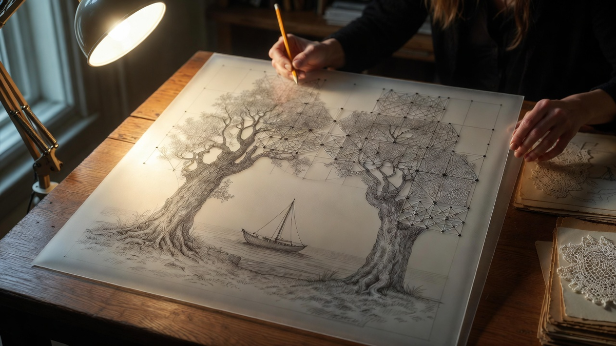 Она поняла, что не будет копировать. Она будет интерпретировать. Взять замысел Насти как тему и развить его, используя язык, который начала постигать – язык кружева. Но для этого нужно было сделать то, чего она ещё не делала: создать свой собственный сколок. Не по готовому образцу, а с нуля. Превратить художественный эскиз в точную схему для плетения.