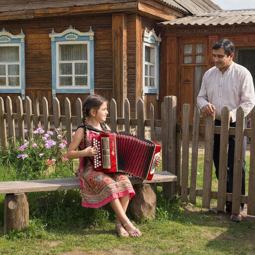 Я сидела в палисаднике и играла на баяне, ну как играла, пыталась, меня дед научил на одной стороне баяна играть: словно замерло все до рассвета... ну вот, а напротив в землянку заселились армяне.