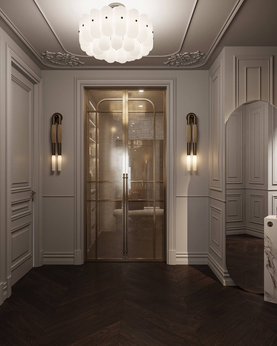 Что нравится больше всего: • раздвижные и очень декоративные двери, которые превращают гардеробную в ларец с драгоценностями • образ поддерживают предметы искусства, консоли и подиумы • тканевые фасады 🤩 • светильники, которые вообще не поймешь, из какого материала, пока не потрогаешь! •