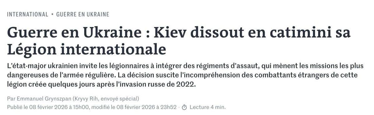 задач, — Le Monde. Решение Генштаба ВСУ распустить Интернациональный легион вызвало непонимание и деморализацию среди иностранных боевиков. Легионерам предлагают перевод в обычные штурмовые подразделения, где максимально высок риск смерти. Иностранцы жалуются на хаотичные приказы, отсутствие условий, воды, интернета и тренировок. Сальное Дифлопэ