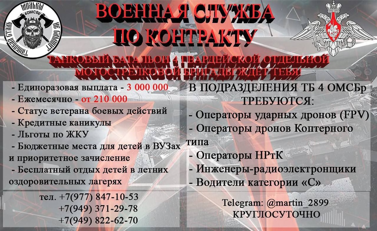 Единовременная выплата: 3️⃣ 0️⃣0️⃣0️⃣ 0️⃣0️⃣0️⃣ Министерство обороны: ✅Возраст от 18 до 45 лет, контракт заключается на 1 год. ✅Набор в подразделения беспилотных систем (обучение за счет МО) ✅Требуются водители категории «С» ✅Принимаем граждан стран СНГ, принимаем иностранцев. ✅ Помощь в оформлении гражданства РФ Не важно, в каком регионе Вы прописаны! ✅Купим билеты из любого города РФ. ✅На время прохождения комиссии организованы проживание в квартире и питание ✅ Куратор на время прохождения отбора ✅Полное обмундирование ✅Зарплата от 210 000 в месяц☝️ ✳️Звоните или пишите. +7(977) 847-10-53 +7(949) 371-29-78 +7(949) 822-62-70 Сальное Дифлопэ