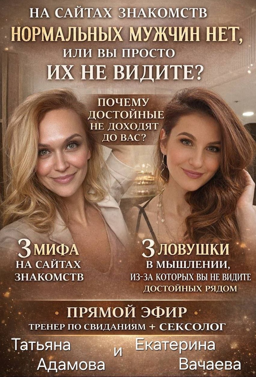 ❓Почему с мужчинами, которые реально важны, я веду себя как дура? ❓ Почему переписка идёт идеально, а при мысли о близости хочется, как ёжик, собрать мешочек и свалить в туман? ❓ Почему адекватные мужчины кажутся скучными, а тянет к дерзким и нестабильным? И всё это - старый сценарий, который включается автоматически, как только мужчина становится важным. 🔴Эфиру быть! На нём мы с Татьяной Адамовой — тренером по свиданиям, журналистом, продюсером международного телеканала — разберём две стороны одной проблемы. О чём будет эфир Я, как сексолог и коуч ICF, расскажу: 🔥 3 ловушки мышления, которые мешают выстраивать близкие отношения. 🔥 Как работа с внутренними сценариями через теорию сиблингов (то есть Ваше место и позиция в семье), влияет на Ваши взаимотношения. 🔥 Как привычки, скрытые реакции и семейные сценарии формируют то, как мужчины ведут себя рядом с вами Татьяна разберёт: 🔥 3 мифа, из-за которых на сайтах знакомств вы не замечаете адекватных мужчин. 🔥 Почему ощущен