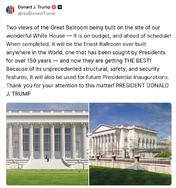 Trump says his new ballroom will be the ‘finest Ballroom ever built anywhere in the World’ and will be used for FUTURE INAUGURATIONS