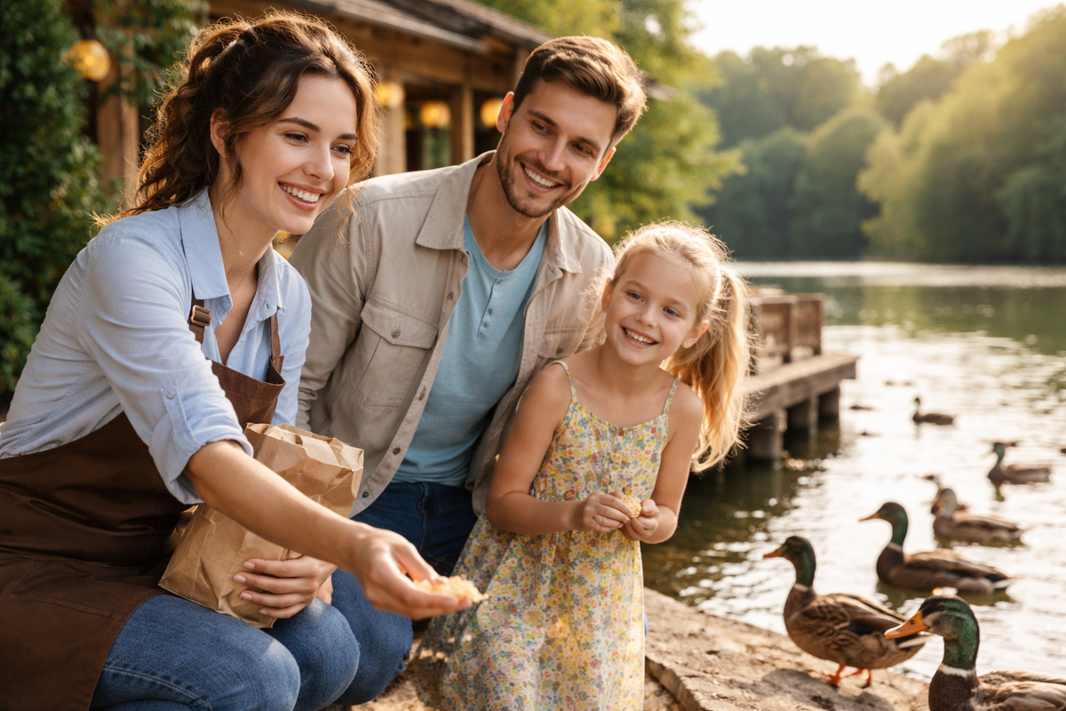 Нина успела взять на кухне мешочек с хлебом и протянула Маше. Девочка сначала застыла, будто от неожиданности, а потом сделала шаг вперёд. Утки облепили их со всех сторон, и очень скоро Маша звонко засмеялась, наблюдая, как две птицы никак не могут поделить кусок. Пока они спорили, третья ловко стащила добычу и унеслась прочь.