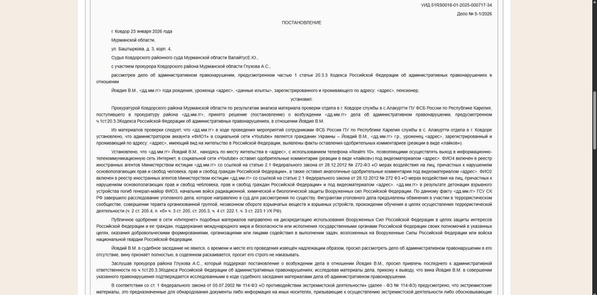 Суд в Мурманской области впервые оштрафовал человека за лайки под роликами иноагентов на YouTube Ковдорский районный суд Мурманской области назначил административный штраф пенсионеру Василию Йовдию по делу о дискредитации использования Вооруженных сил России. Соответствующее решение вынесено 23 января 2026 года. Согласно материалам дела, Йовдий, являющийся гражданином Украины с видом на жительство в России, администрировал аккаунт в YouTube и оставлял «одобрительные комментарии» в виде лайков под рядом видеороликов. В судебном решении указано, что часть этих материалов была связана с лицами, внесенными Минюстом РФ в реестр иностранных агентов, а также с публикациями об убийстве начальника войск радиационной, химической и биологической защиты Вооруженных сил России генерал-майора Игоря Кириллова. Суд установил, что такие действия носили публичный характер и были направлены на дискредитацию использования российской армии и исполнения государственными органами своих полномочий за пре