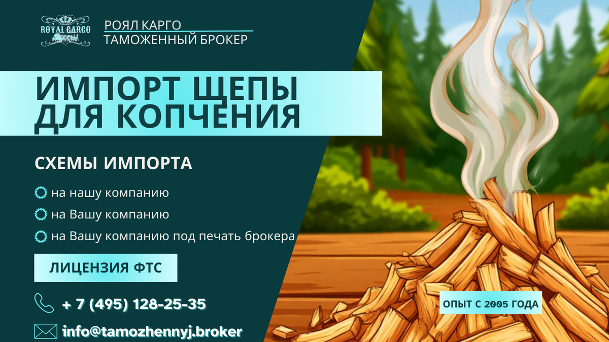 Импорт щепы для копчения — перспективное направление для поставщиков оборудования, ресторанного бизнеса, мясо и рыбопереработчиков, а также ритейла. Качественная древесная щепа (ольха, бук, яблоня, вишня, гикори и др.) востребована благодаря росту популярности копчёных продуктов. Однако внешнеэкономическая деятельность в этой сфере требует учёта таможенных, фитосанитарных и логистических нюансов. Фитосанитарный контроль является обязательной частью импорта любой продукции растительного происхождения, именно фитосанитарный сертификат подтверждает, что товар не заражён карантинными вредителями, не содержит опасных микроорганизмов, при необходимости прошёл специальную обработку и полностью соответствует требованиям страны импортёра, оформляется данный документ уполномоченным государственным органом страны экспортёра. Получение сертификата требуется практически во всех случаях, если щепа произведена из необработанной древесины, содержит остатки коры либо не подвергалась термической обработ