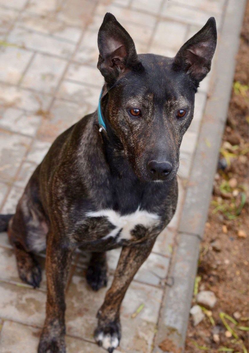 Она метис голландской овчарки и стаффа. Миниатюрная в холке – ниже 40 см.