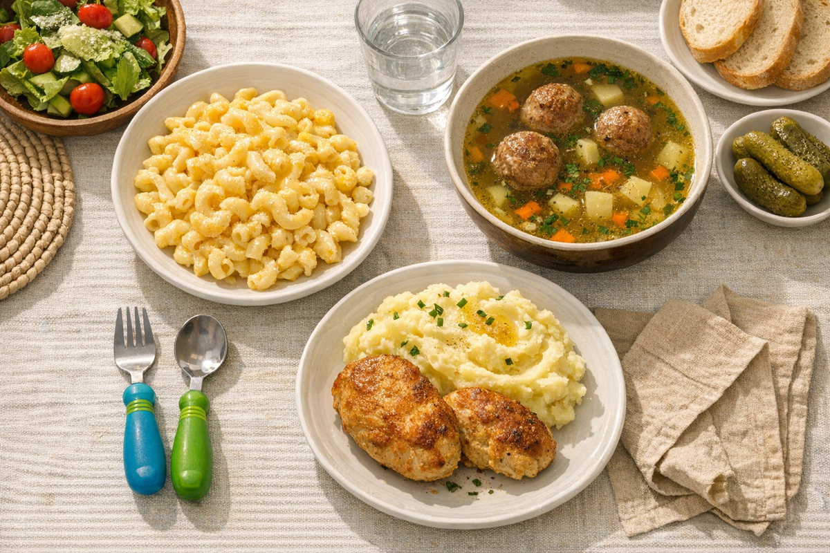 С “семейными” ужинами обычно две задачи: чтобы было не остро, не слишком жирно и без странных сочетаний, и чтобы готовилось быстро. Ниже 10 вариантов, которые чаще всего заходят детям и при этом не требуют сложных продуктов. В каждом варианте есть простая замена, если чего-то нет.
