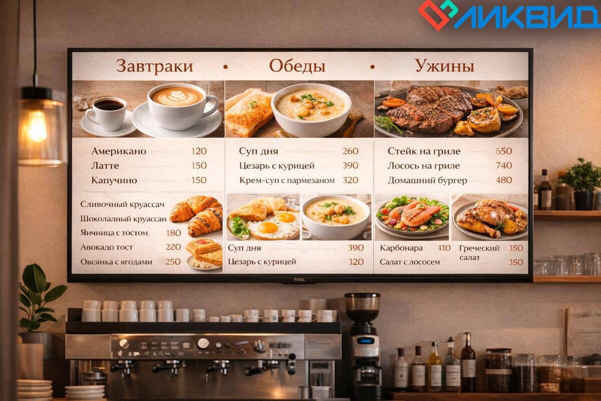 Задача: В кафе нужно показывать разное меню в течение дня: 🌅 утром — завтраки и кофе, ☀️ днём — бизнес-ланч, 🌙 вечером — спецпредложения, акции и апселл. Раньше это выглядело так: бумажные меню, таблички на стойке, забытые акции и вечный вопрос от гостей: «А ланч ещё действует?» 🤷♂️ 🛠️ Настроили Digital Signage через Ликвид ❤️: ✅ отдельные плейлисты под время суток — утро / день / вечер; ✅ разные экраны и сценарии для кассы, зала и витрины; ✅ расписание показа — контент автоматически меняется по времени, без участия персонала; ✅ обновление меню и цен удалённо, за пару кликов. 📺 Как это работает в реальности 🕗 Утром экран у кассы показывает завтраки и напитки. 🕛 В обед автоматически включается бизнес-ланч с актуальной ценой. 🕕 Вечером — акции, комбо и спецпредложения. Никто ничего не переключает вручную, меню не «зависает» и всегда соответствует времени дня. 🎯 Как итог ✔️ контент всегда актуальный ✔️ персонал не «правит прайс руками» ✔️ акции не забываются ✔️ гости быс