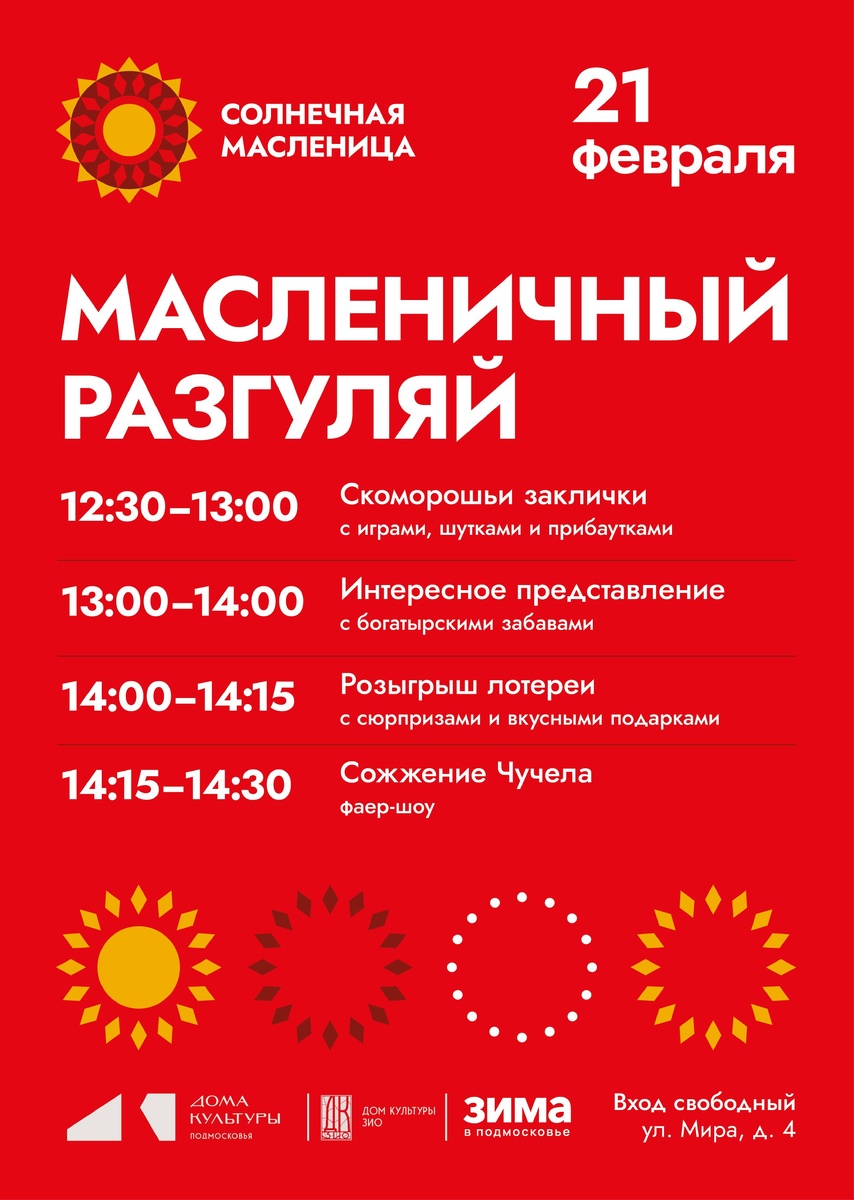 ! Дом культуры ЗИО приглашает гостей на яркое празднование солнечной Масленицы! 21 февраля в 12:30 наши творческие коллективы приготовили для вас настоящий фольклорный праздник. ✨ Вас встретят скоморохи с играми и прибаутками, богатырские забавы и красочное представление. 🎁 Каждого гостя ждёт участие в лотерее с вкусными сюрпризами. 🌞 Приходите проводить зиму и встретить весну в тёплой, праздничной атмосфере. Ждём всех, кто хочет зарядиться весенним настроением и погрузиться в народные традиции. Вход свободный! #ДКЗИО #Масленица #ПраздникВесны #Подольск #Фольклор #НародныеГуляния #СвободныйВход