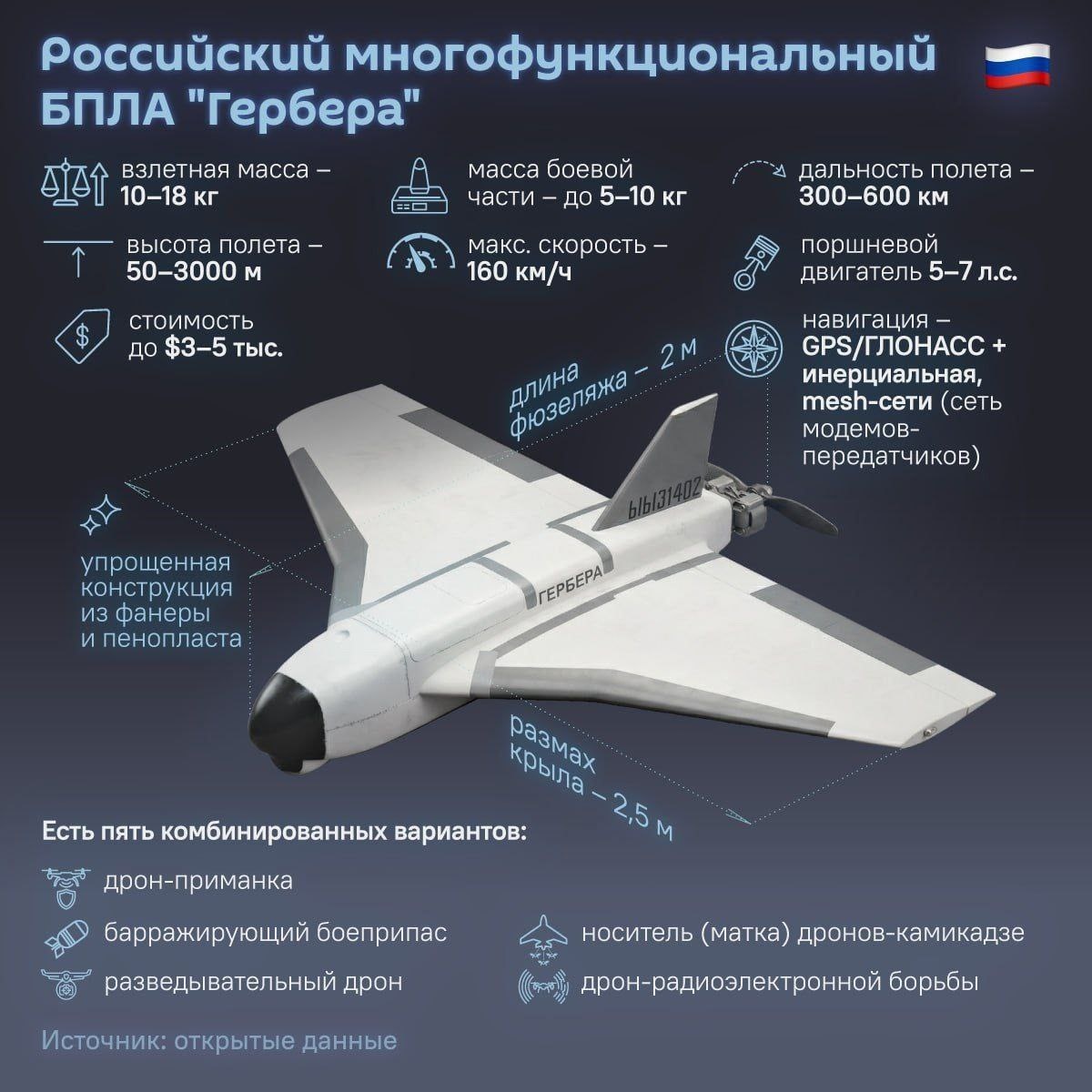 ". Что нужно знать про один из "цветков" в "букете" знаменитых БПЛА армии России. Сестра "Гераней". Что такое "Гербера"? Это компактный дрон, сочетающий простоту конструкции и низкую стоимость (от $2 тыс. до $10 тыс.). Внешне он похож на "Герань", но меньше по размеру и сделан из фанеры и пенопласта. Созданный в 2024 году БПЛА "Гербера" выступал лишь приманкой, задачей которого была перегрузка средств ПВО ВСУ. Спустя два года применения он может быть камикадзе, маткой и ретранслятором. Ловля на живца. Зачем нужны приманки? Здесь всё просто. Стоимость одной "Герберы" сильно ниже не только "Герани", но и большинства зенитных ракет ПВО ВСУ. Несколько сотен "Гербер", летящих в первых волнах ракетно-дронового удара, разряжают на себя ЗРК ВСУ. Это создает невыгодный "обмен" для ПВО ВСУ: сбивая дешёвый дрон дорогой ракетой, украинцы истощают свои запасы. От простого к сложному. С момента своего первого появления "Герберы" получили множество улучшений. С 2024-го на них начали ставить помех